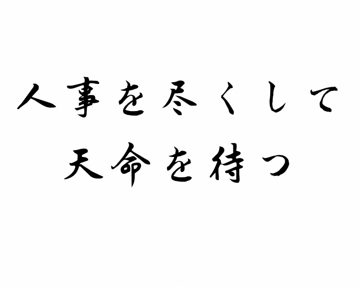 This week's Japanese proverb is: 人事を尽くして天命を待つ (JIN-JI WO TSUKU-SHITE TENMEI WO MATSU). 人事/JIN-JI = human affairs or actions, 尽くして/TSUKU-SHITE = do to exhaustion, 天命/TENMEI = god's will or heaven's decree, and 待つ/MATSU = to wait. So these Kanji characters combine to mean that you can work hard and make a best effort to prepare, but there comes a point where you have to stop, and then wait to see how things play out. Old Japanese wisdom recognizes that there are things (like the force of nature) which just cannot be controlled by people, despite the best plans -- so, accept it. Similar Western sayings are: "Do your best, and leave the rest to fate", "Man proposes, God disposes", and "To strive is human, to reward is divine."