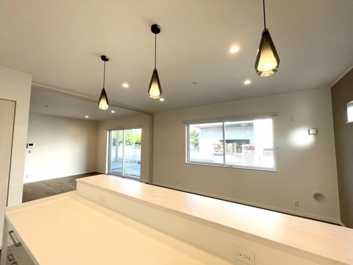 In addition, the fixed wall windows in the dining space and the three lights hanging over the kitchen counter are attractive accents. The wallpaper provides another accent with its harmonious and soothing color.