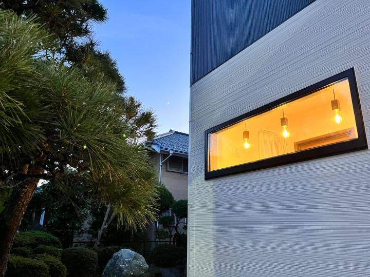 A magnificent pine tree is located near the property's entrance gate, and three pendant lights peek out from the study window -- all of these give off the feeling of a warm welcome to residents and visitors.
