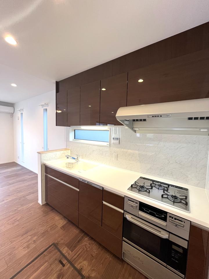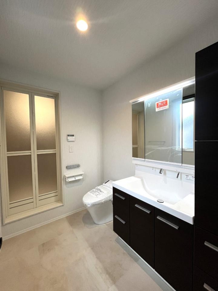 The new-construction house has four bedrooms, one Japanese-style-bath room on the first floor and one in the master bedroom (shower room), also three toilets in total, and parking space for two cars.