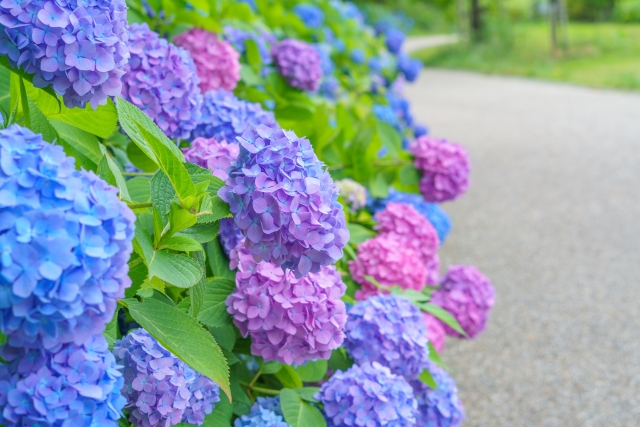 The month of June in the Yokosuka City and Miura Peninsula areas is a time of seasonal transition, where the cool drier air of early spring is increasingly replaced by warmer and more humid air. In fact, usually by mid-June, there will begin a period of frequent wet weather fronts moving from west to east -- a time which is called TSUYU (梅雨), the rainy season. The TSUYU rainy season will last for about one month, until early-July, when the hot summer season begins. In several articles, which are posted on our company's Staff Blog (see link below), we looked at how to deal with problems the humid air can cause in your Japanese house, and we hope you they will be helpful for you. Another aspect of the warmer, wetter air is that among the lush green scenery around Yokosuka, there start to appear beautiful blue, pink, violet, and white flowers. These are AJISAI (紫陽花), or Hydrangeas -- the most symbolic blooms of the rainy season. AJISAI/Hydrangeas are medium-sized shrubs which are famous for their flowers which appear in numerous clusters. They bloom during June, with the rains, and eventually wilt when the summer heat arrives. AJISAI growing in acidic soil will produce blue flowers, those in alkaline soil will be colored pink. Hydrangea are native to Japan and they have been mentioned in written records over 1300 years ago. Of note, AJISAI, both wild and planted, bloom in many places, but one notable spot where their beauty can be viewed and appreciated is Yokosuka's Museum of Art in Kannonzaki Park (link below), where over 300 Hydrangeas have been planted along walkways near the building. We hope you will be able to enjoy the beauty of these rainy season flowers.