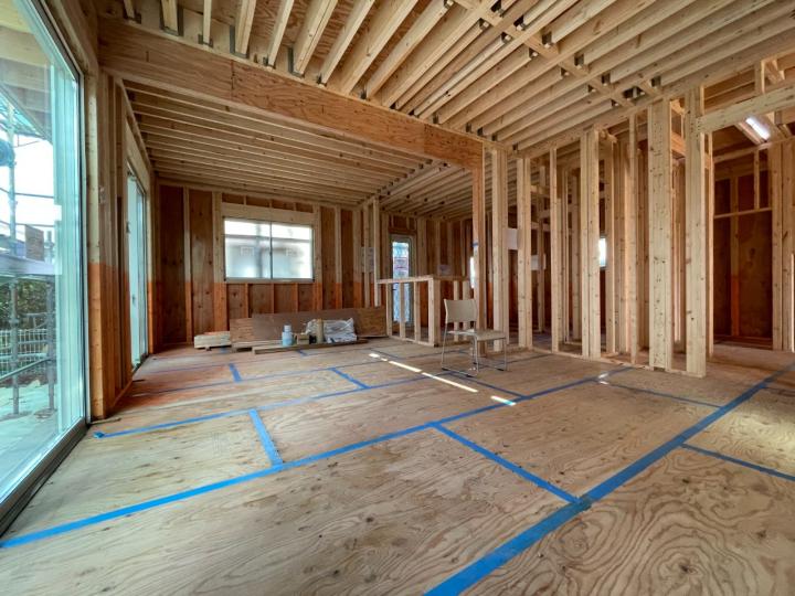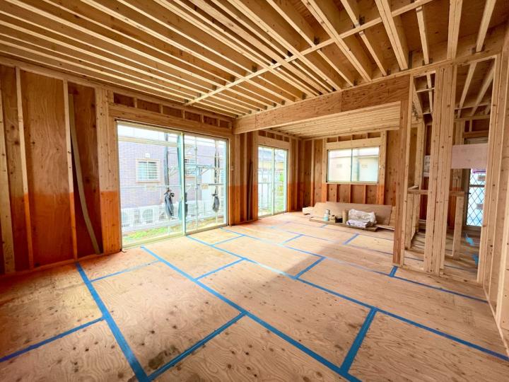 After the building was raised, a meeting was held with the owner to confirm the situation at the site. We checked/confirmed on the spot for door openings, switch locations, numbers of electrical outlets, etc., which we may not have noticed on the drawings. It is often the case that the usability factor is surprisingly different between what you imagined and when you actually simulate/confirm it on-site, and it is important to make small adjustments at this time. So, for example, in this case, we again were challenged to determine the best positions to install the light switches in the staircase area. Of note, the windows on the exterior wall side have already been installed, and interior work will continue to progress.