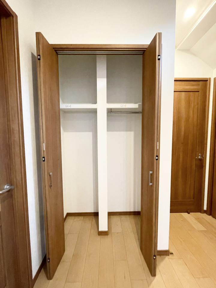 There is plenty of storage space not only in the living room but also in the hallway area for the convenience of those who have a lot of luggage. The storage space in front of the entrance is divided into two halves, with a hanger rail for hanging coats on the right side only and an area for storing tall items on the left side. There is also a shelf for storing small items.