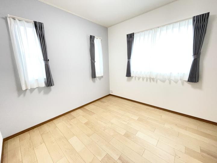 All the rooms on the second floor have windows on two sides, making it easy to let in light and allowing for good ventilation. Each room has an accent wall, and we changed the color of the curtains to match the wallpaper. The curtains are made of light-blocking drapes and lace and are generally simple and without patterns so that they match the furniture brought in by the tenants.