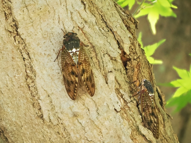 During the hot summer months in the Yokosuka City and Miura Peninsula areas, the buzzing, chirping, and keening sounds made by cicadas can be heard. The cicada is a large, fly-shaped, winged insect, which makes a lot of noise, but does not bite or sting. In Japanese, cicada is called: "semi" (蝉, pronounced: "seh-mee"). You can often see children with nets trying to catch semis or other insects, such as beetles, butterflies, praying mantis, dragon flies, etc. -- and for more information about Japanese bug catching custom, please click on the link below. Semis have also inspired some cultural phrases and proverbs. The sounds of all the semis singing together can be quite noticeable and even noisy, so it is like "A (rain) shower of cicada cries", or 蝉の時雨, (Semi no shi-gu-reh). Another saying goes like this: 蛍二十日蝉三日, (Hotaru hatsuka, semi mikka) -- which can be translated as: "The firefly lives 20 days, the cicada 3 days", and its meaning is that, like short-lived summer insects, time passes quickly, life is evanescent. Finally, there is: 夏の虫氷を笑う (Natsu no mushi ko-ri wo warau), which translates as "The summer insect laughs at the idea of ice", and means that some people, who have limited knowledge or experience, arbitrarily express their opinions or make fun of things they do not understand. We hope you can stay cool during the hot Japanese summer days amidst the sounds of insects.