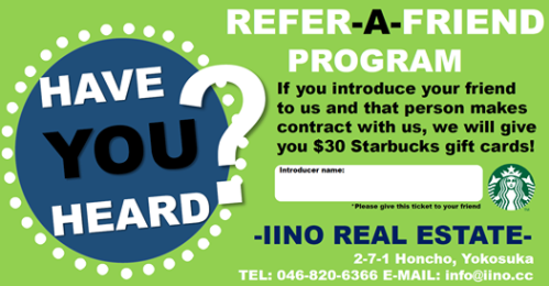 ✨Refer-a-Friend Campaign👭✨| Off Base Housing Yokosuka | IINO REAL ESTATE is for rental housing in Yokosuka Japan...Civilian, Military house agency