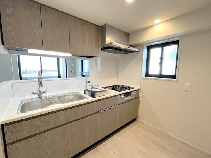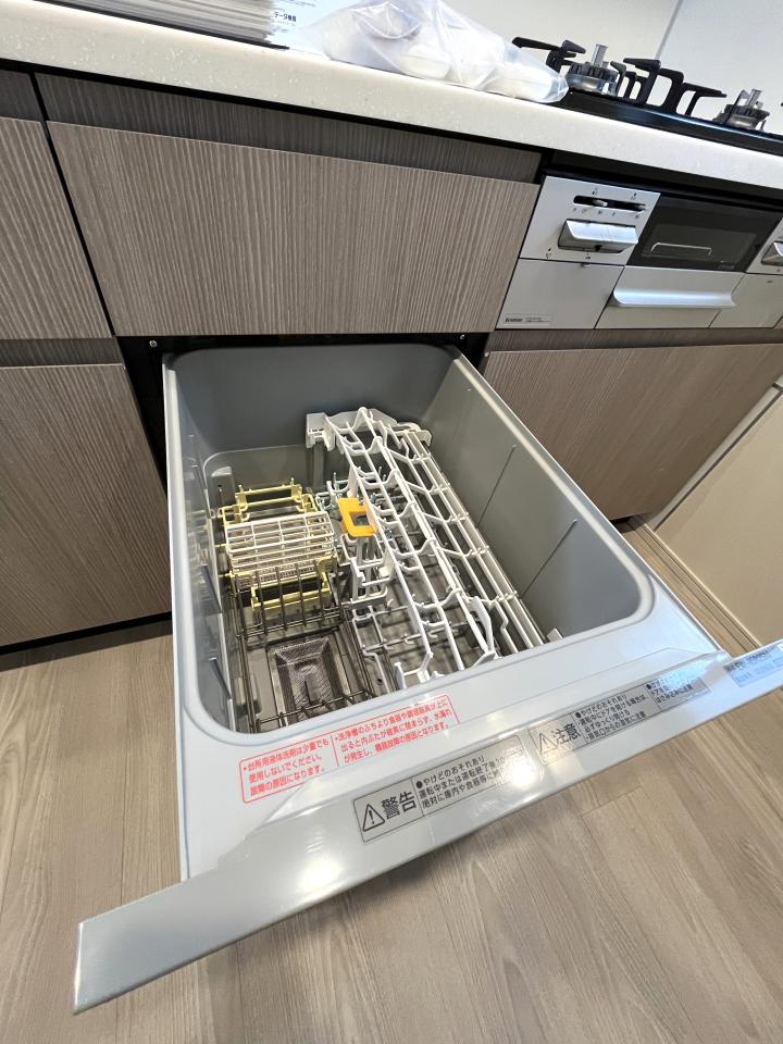 The kitchen is equipped with a three-burner gas stove, fish grill, garbage disposal, water purifier and dishwasher.