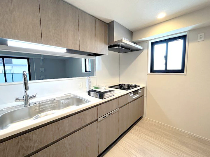 The kitchen is equipped with a three-burner gas stove, fish grill, garbage disposal, water purifier and dishwasher.
