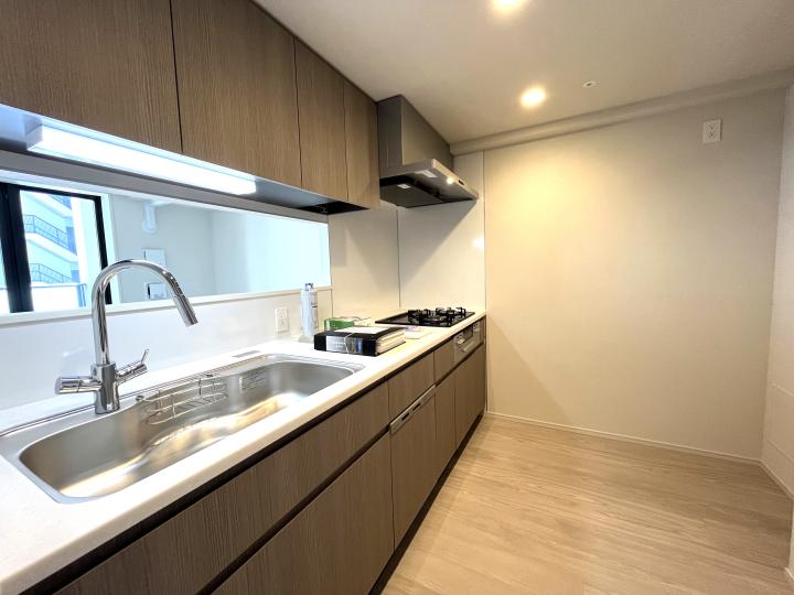 The kitchen is equipped with a three-burner gas stove, fish grill, garbage disposal, water purifier and dishwasher.