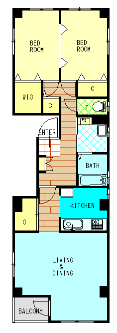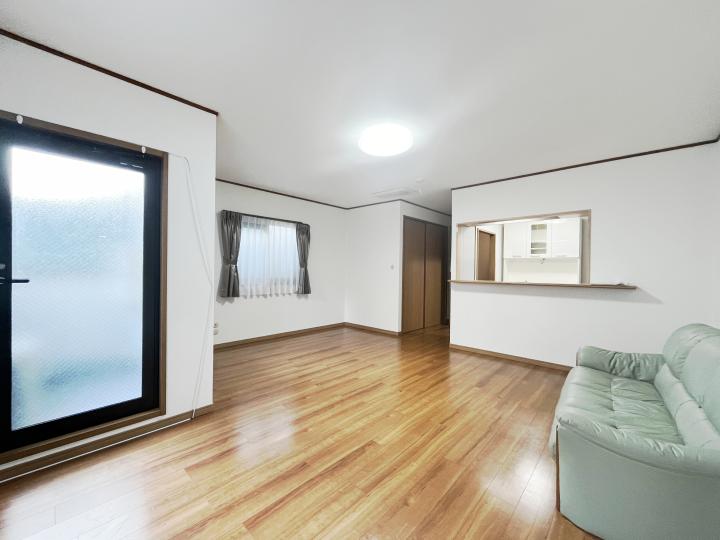 2 BRs, 1 Bathroom, 1 Full shower room, It's simple layout. Furniture such as two separated couch and cabinet in the kitchen is installed.