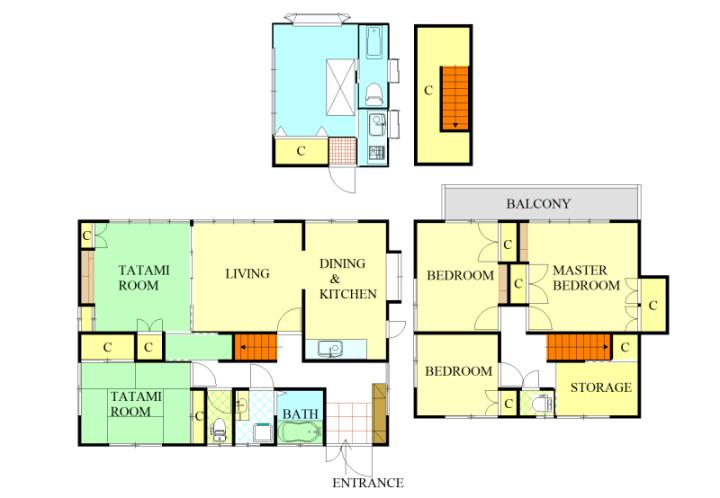 Kitchen has stove and Oven,Quiet Residence Area, With Guest Cottage, 20 mins driving to the base, Walking distance to bus stop, 1 parking space, 2 tatami room with carpet, 3 bedrooms in second floor, Family size house, Traditional japanese style yard.