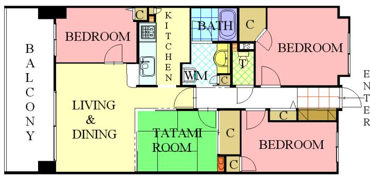 Over 900 Sqft, 4 BR including one tatami room, 1 Toilet, 1 Full shower room, and comes with 1 parking spot.