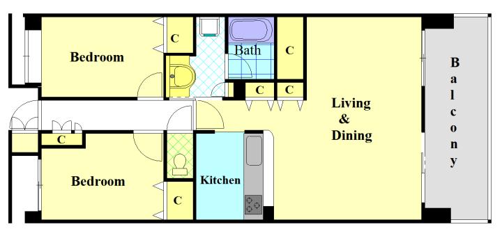 This 2 bedrooms apartment comes with 1 toilet, 1 full shower room.