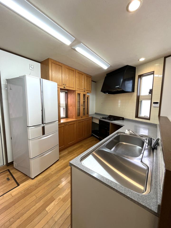 The L-shaped kitchen includes a large sink, oven, fish grill, three gas burners, built-in cabinets, and a refrigerator. ✨